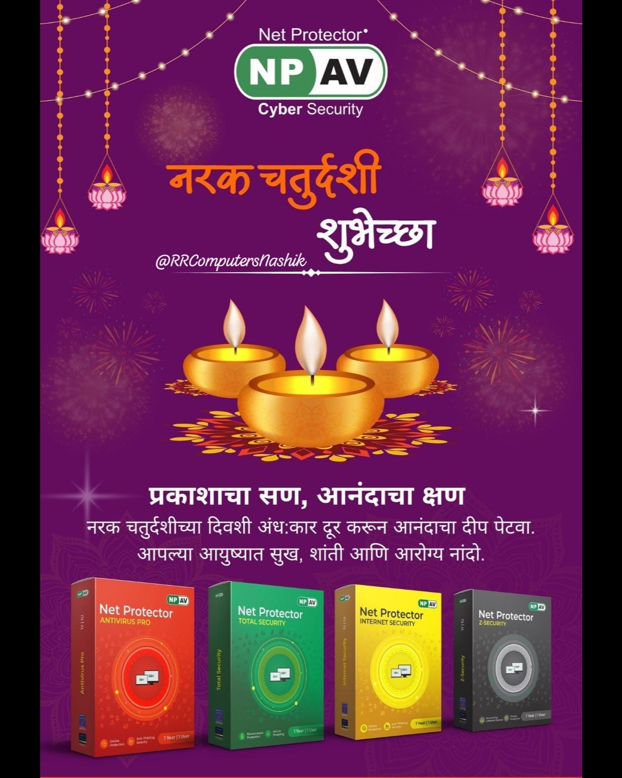 🪔 नरक चतुर्दशीच्या शुभेच्छा! या दिवशी अंध:कार दूर करून आनंद, शांती आणि सुरक्षिततेचा प्रकाश आपल्या जीवनात उजळो 🌟 🔐 RR Computers Nashik & NPAV Cyber Security तर्फे शुभेच्छा ✨ 📞 9579993142 | 🌐 www.laptopservicecenternashik.com #NarakChaturdashi #NPAV #CyberSafety #RRComputers #Nashik